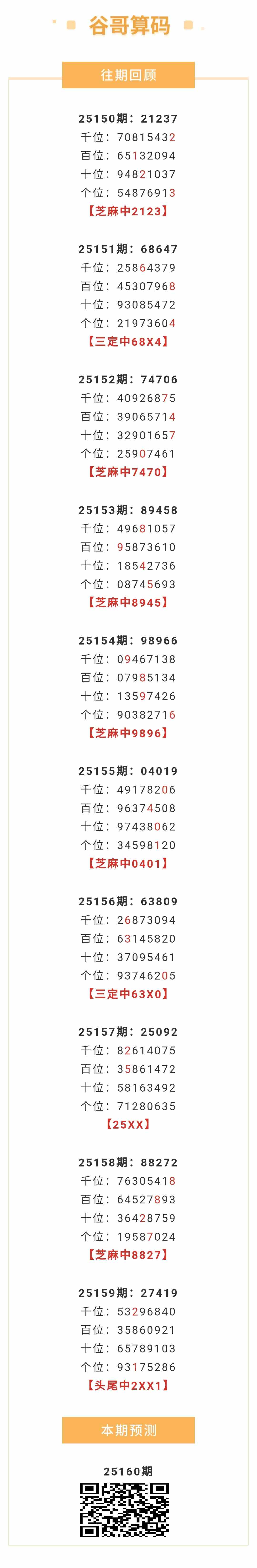 【排列五-25160期】本月圈中10次芝麻,芝麻近10中6;上期一四中2XX1