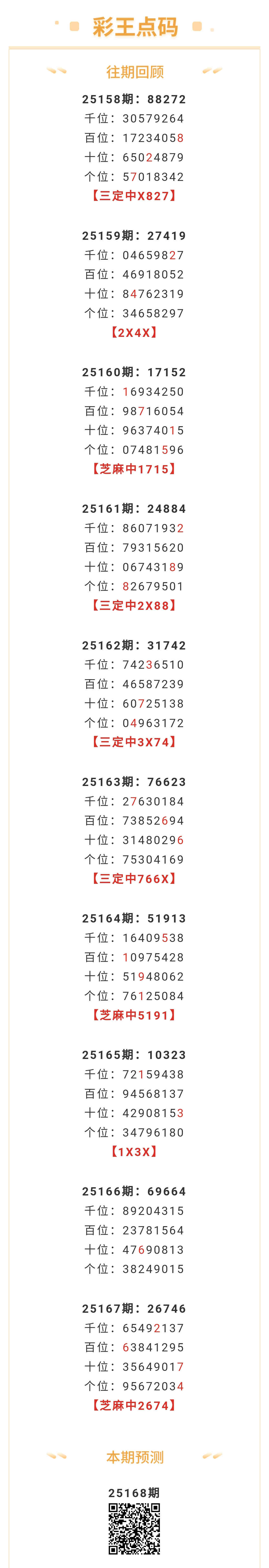 【排列五-25168期】本月圈中11次芝麻,芝麻近10中3;上期芝麻中2674