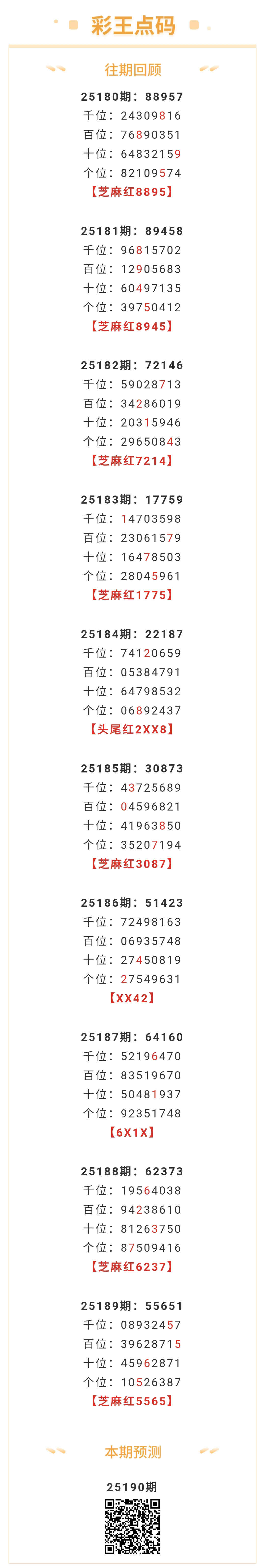【排列五-25190期】本月圈红10次芝麻,芝麻近10红7;上期芝麻红5565