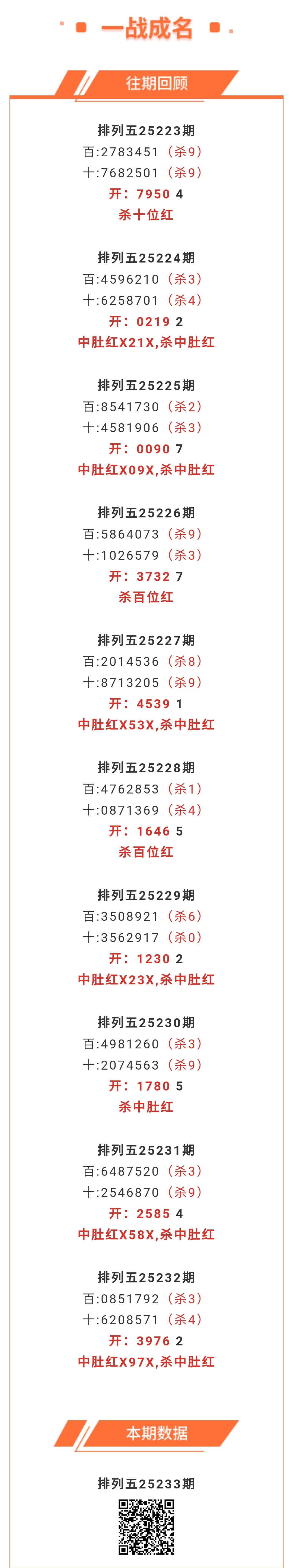 【排列五-25233期】本月圈红15次中肚,中肚近10红6;上期中肚红X97X