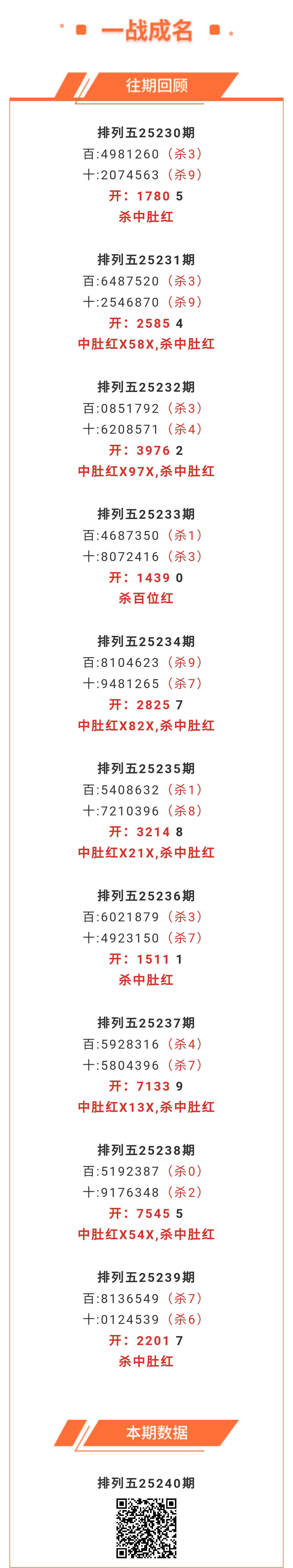 【排列五-25240期】本月圈红4次中肚,中肚近10红6;上期杀中肚红