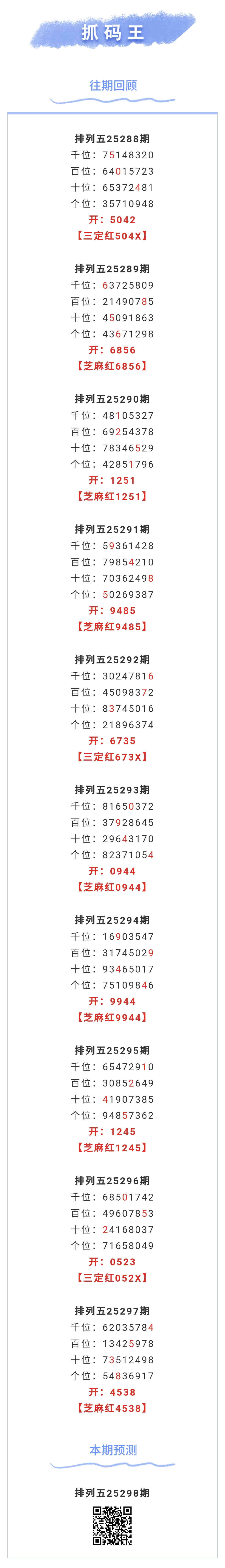 【排列五-25298期】本月圈红5次芝麻,芝麻近10红7;上期芝麻红4538