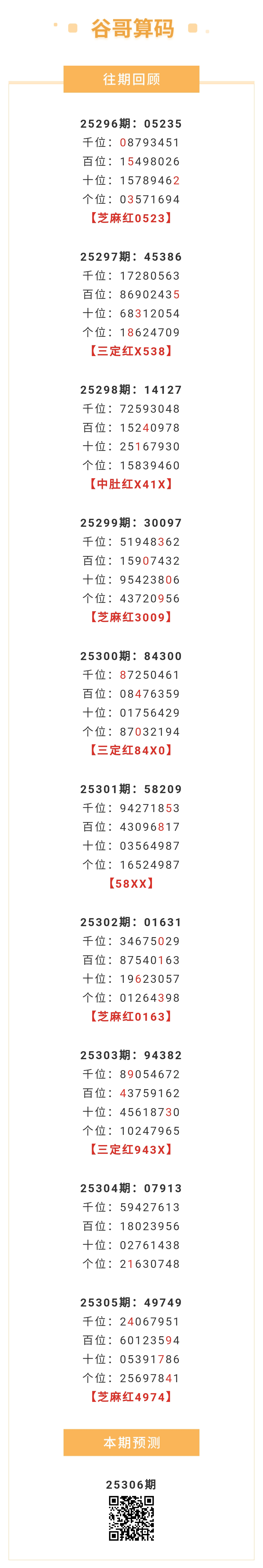 【排列五-25306期】本月圈红7次芝麻,芝麻近10红4;上期芝麻红4974