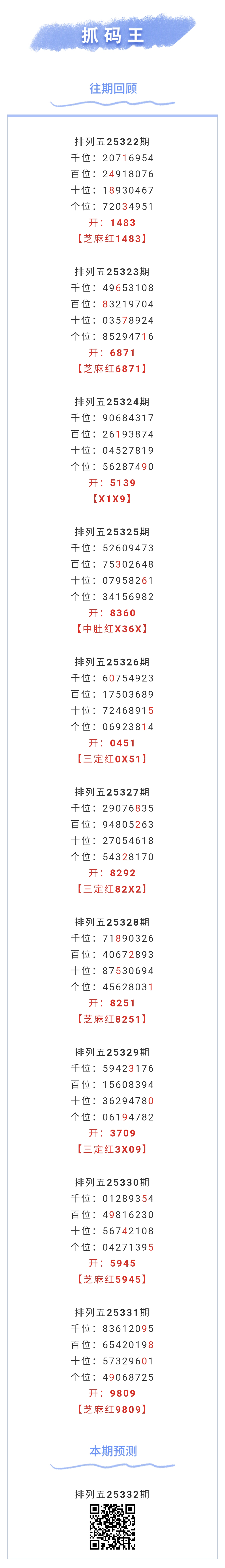 【排列五-25332期】芝麻2连红!本月圈红5次芝麻,芝麻近10红5;上期芝麻红9809