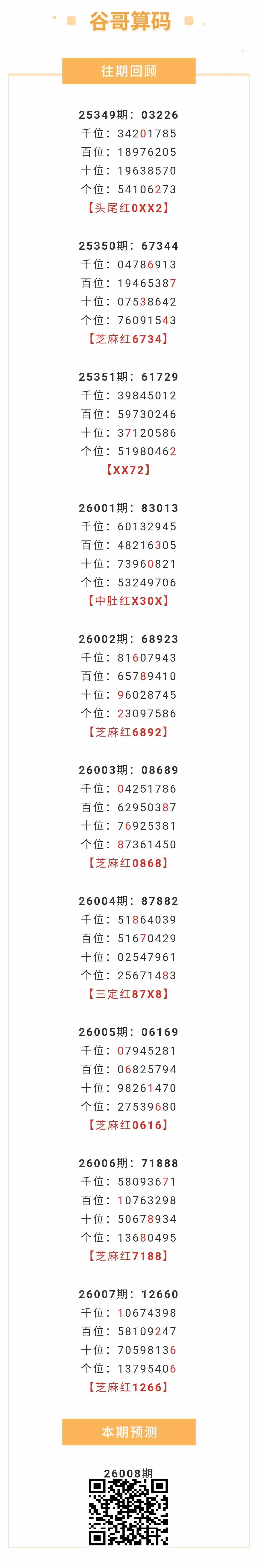【排列五-26008期】本月圈红5次芝麻,芝麻近10红6;上期芝麻红1266