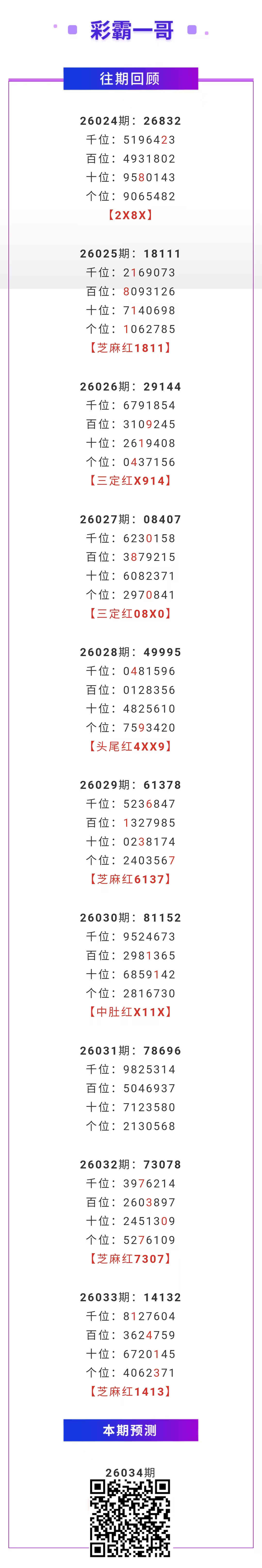 【排列五-26034期】芝麻红2连红,本月圈红2次芝麻,芝麻近10红4;上期芝麻红1413