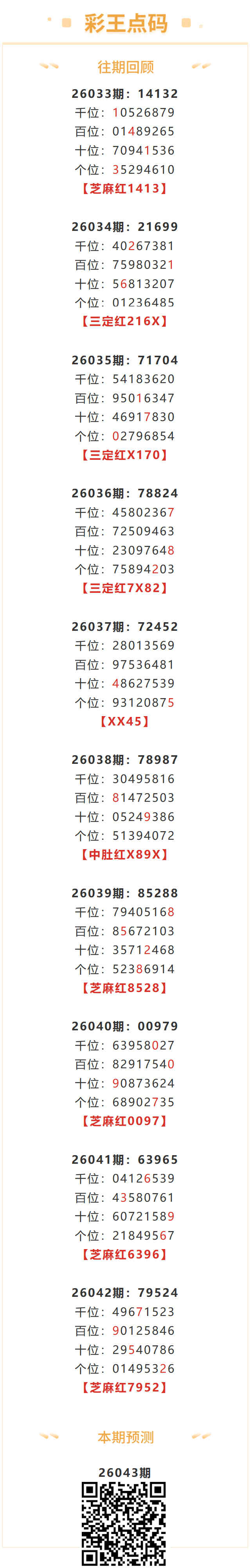 【排列五-26043期】芝麻4连红!本月圈红5次芝麻,芝麻近10红5;上期芝麻红7952