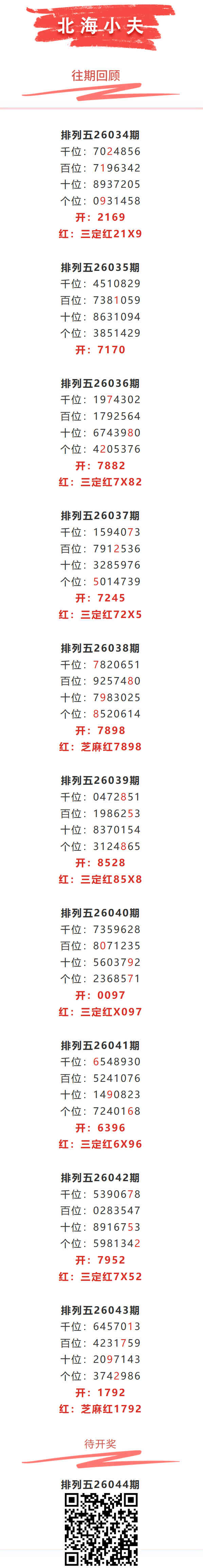 【排列五-26044期】本月圈红3次芝麻,芝麻近10红2;上期芝麻红1792