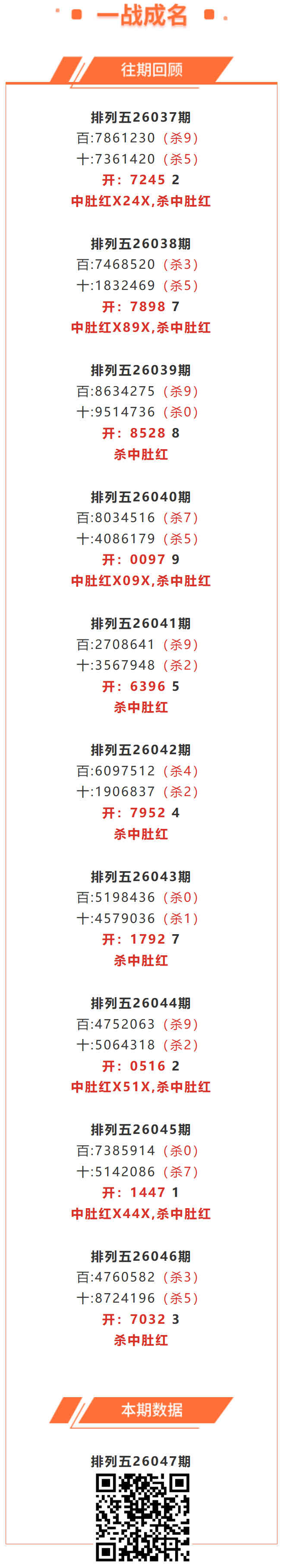 【排列五-26047期】杀中肚13连红!本月圈红9次中肚,中肚近10红5;上期杀中肚红