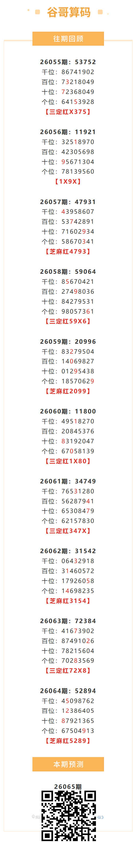 【排列五-26065期】本月圈红4次芝麻,芝麻近10红4;上期芝麻红5289