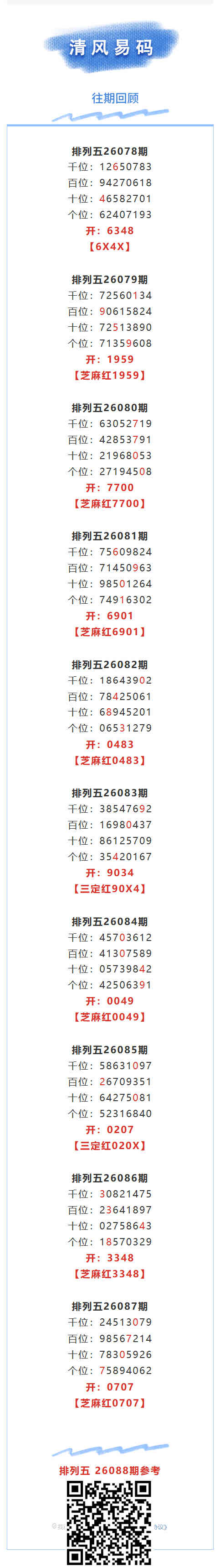 【排列五-26088期】芝麻2连红!本月圈红5次芝麻,芝麻近10红7;上期芝麻红0707