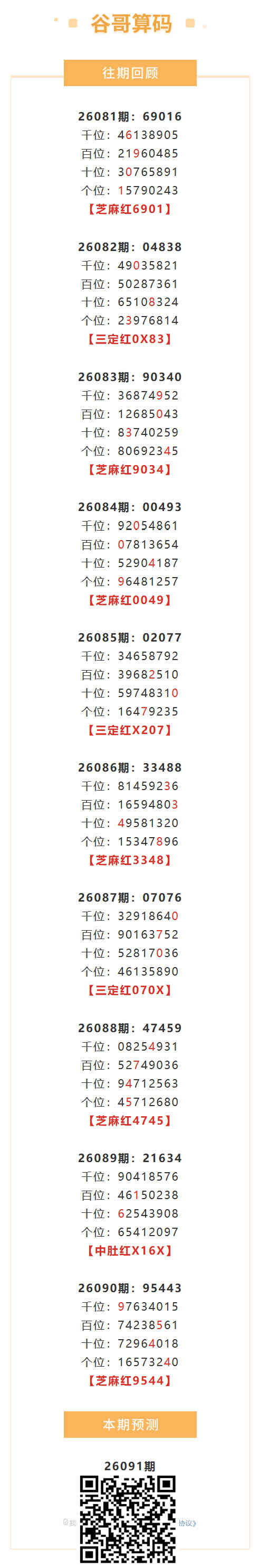 【排列五-26091期】本月圈红6次芝麻,芝麻近10红6;上期芝麻红9544