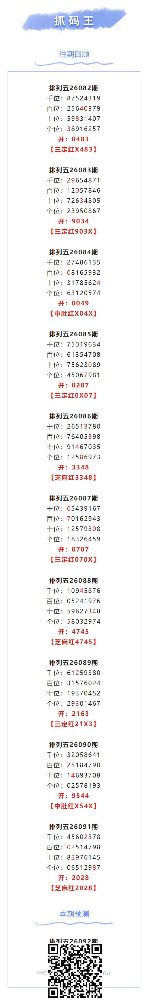 【排列五-26092期】本月圈红3次芝麻,三定近10红5;上期芝麻红2028