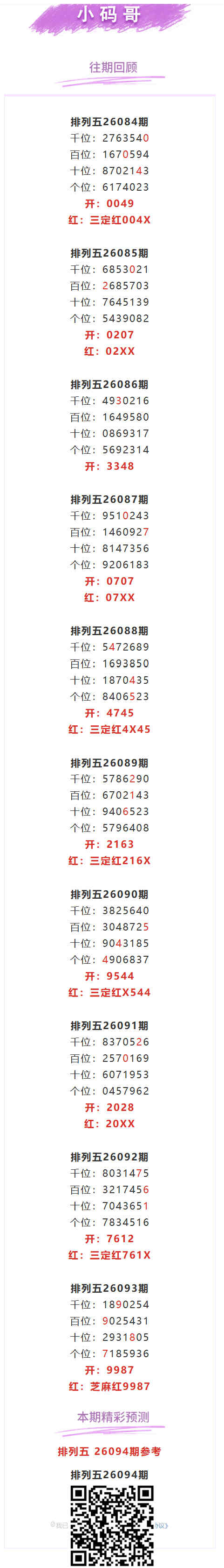 【排列五-26094期】本月圈红2次芝麻,三定近10红5;上期芝麻红9987