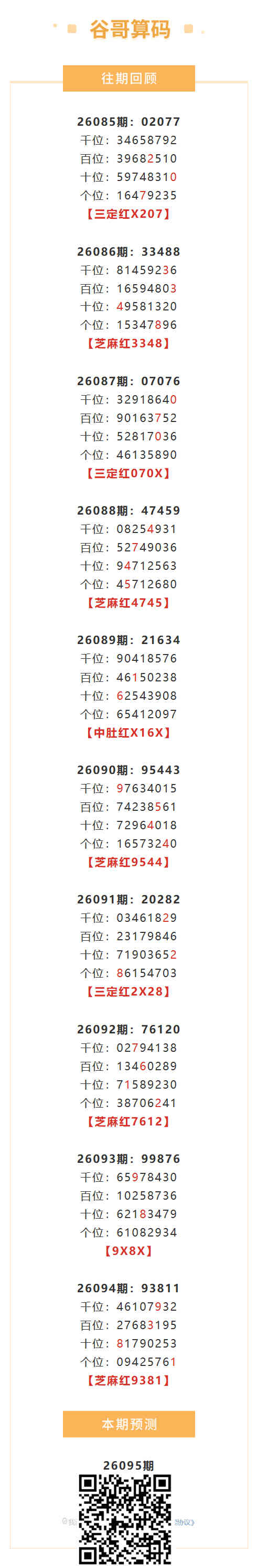 【排列五-26095期】本月圈红8次芝麻,芝麻近10红5;上期芝麻红9381