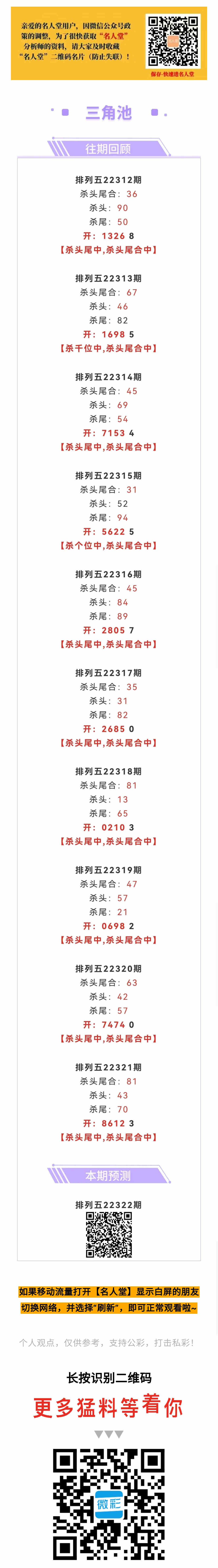 【排列五-322期】上月圈中27次杀头尾合,杀头尾合近10中10;上期杀头尾中,杀头尾合中