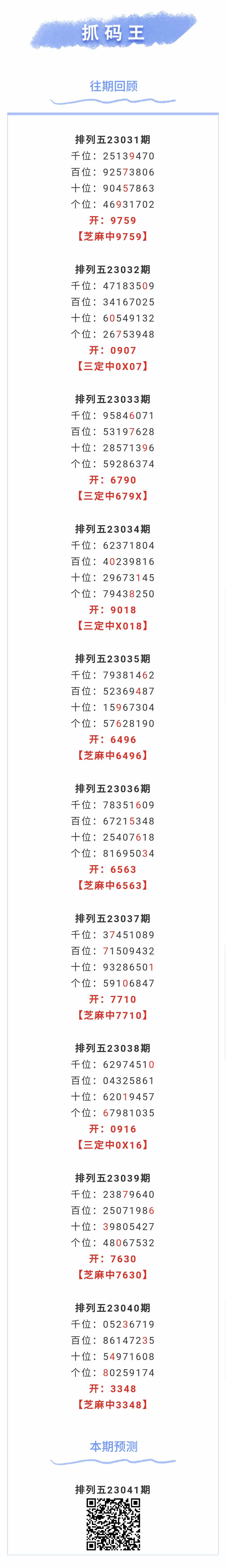 【排列五-041期】芝麻2连中!上期芝麻中3348,芝麻6中5;本月圈中9次芝麻!