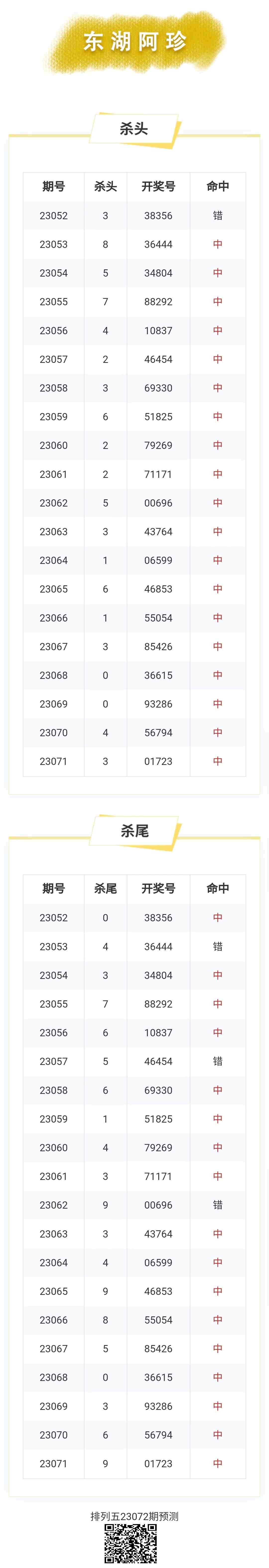【排列五-072期】杀头尾9连中,本月圈中17次杀头尾!