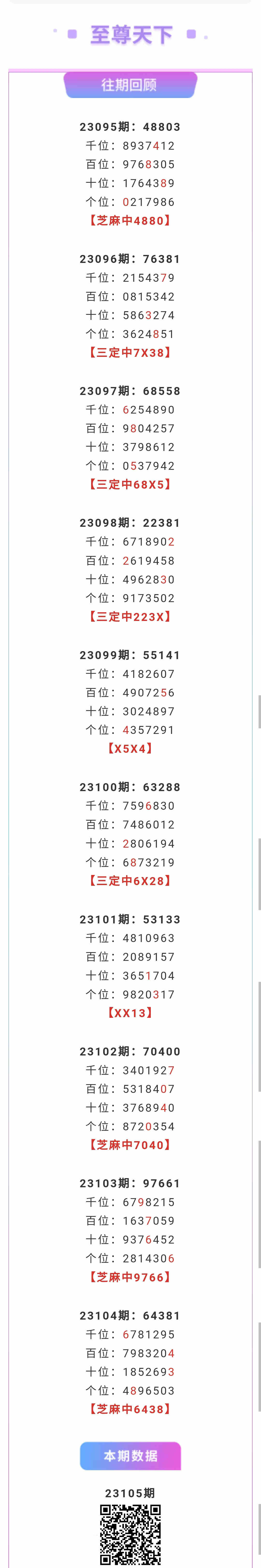【排列五-23105期】本月圈中9次芝麻,芝麻近10中4;上期芝麻中6438