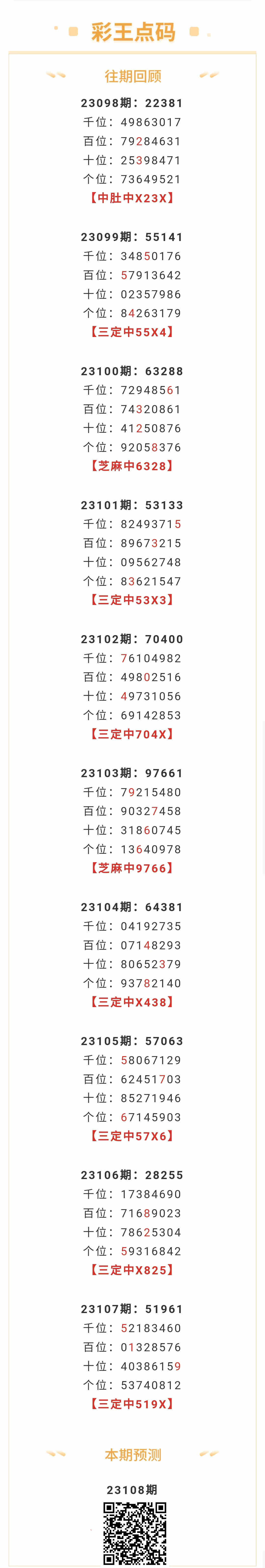 【排列五-23108期】本月圈中10次芝麻,芝麻近10中2;上期三定中519X