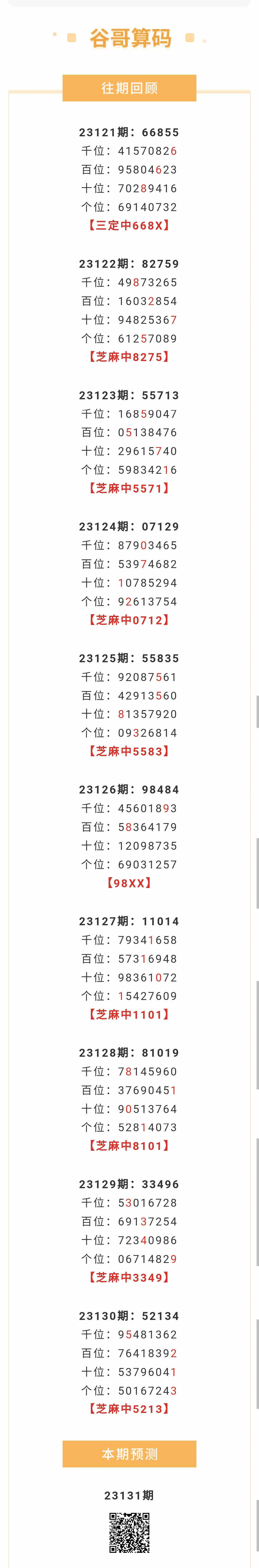 【排列五-131期】本月圈中14次芝麻,芝麻近10中8;上期芝麻中5213