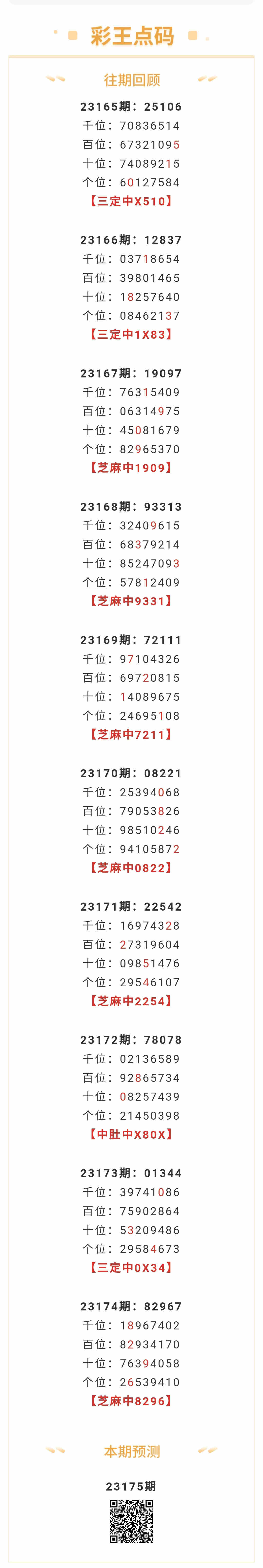【排列五-175期】6月圈中15次芝麻,芝麻近10中6;上期芝麻中8296