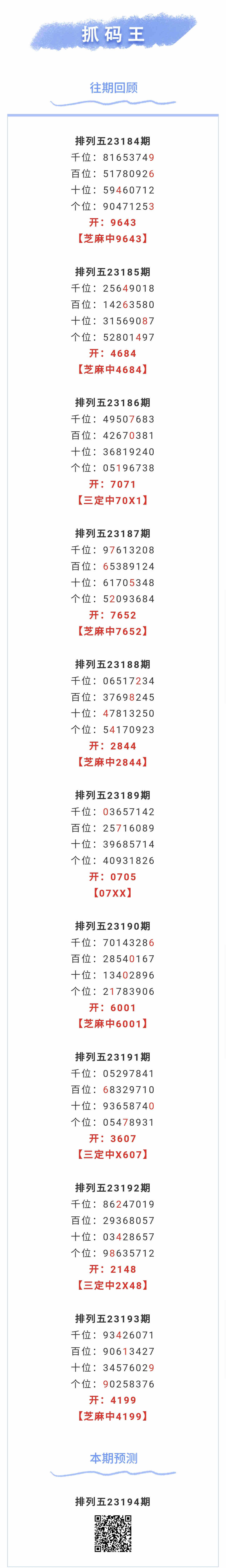 【排列五-194期】本月圈中10次芝麻,芝麻近10中6;上期芝麻中4199
