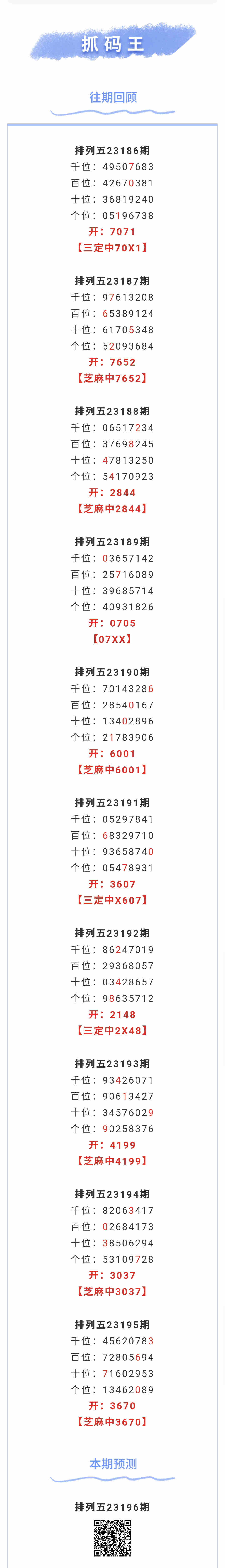 【排列五-196期】本月圈中12次芝麻,芝麻近10中6;上期芝麻中3670