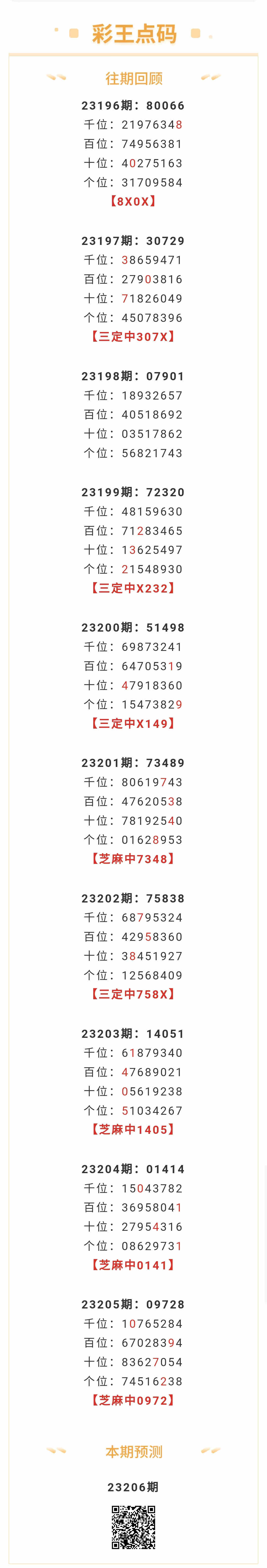 【排列五-23206期】本月圈中3次芝麻,芝麻近10中4;上期芝麻中0972