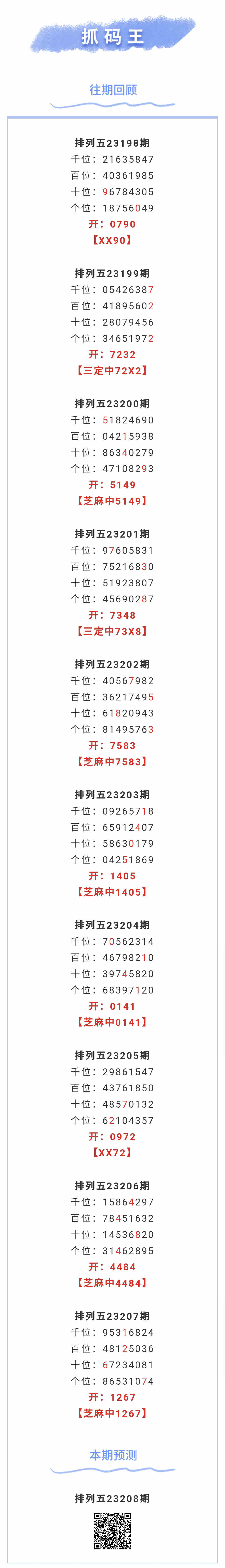【排列五-23208期】本月圈中4次芝麻,芝麻近10中6;上期芝麻中1267