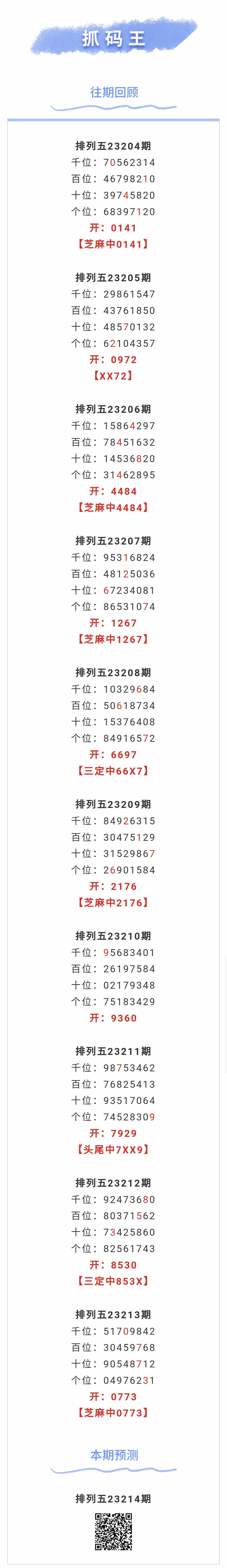 【排列五-23214期】本月圈中6次芝麻,芝麻近10中5;上期芝麻中0773