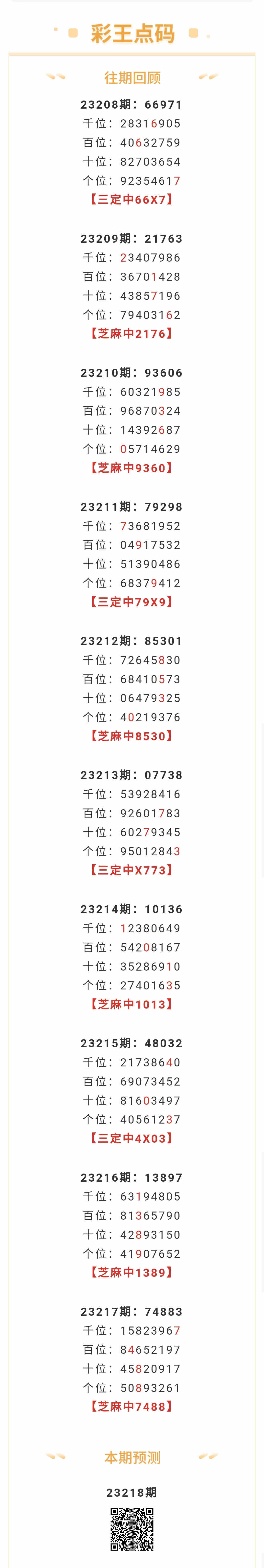 【排列五-23218期】本月圈中10次芝麻,芝麻近10中6;上期芝麻中7488