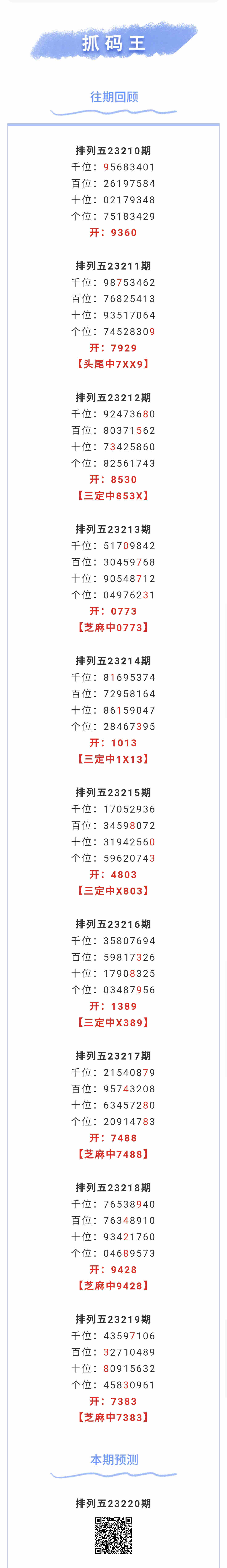 【排列五-23220期】本月圈中9次芝麻,芝麻近10中4;上期芝麻中7383