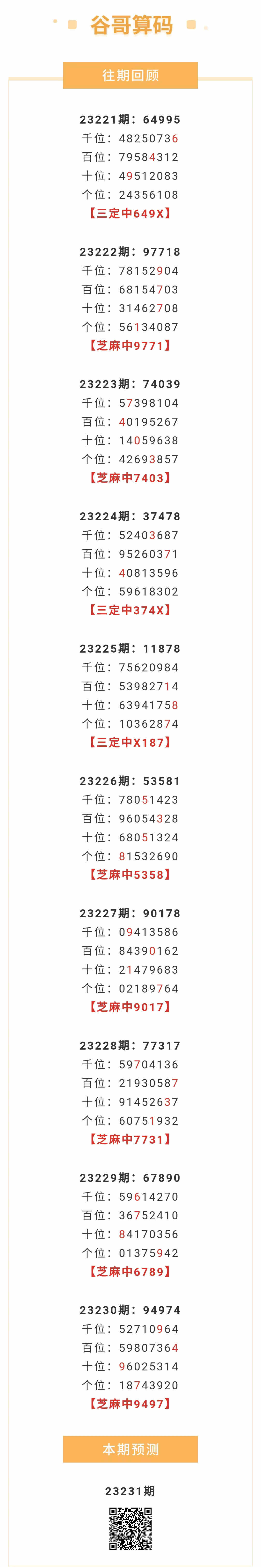 【排列五-23231期】本月圈中16次芝麻,芝麻近10中7;上期芝麻中9497