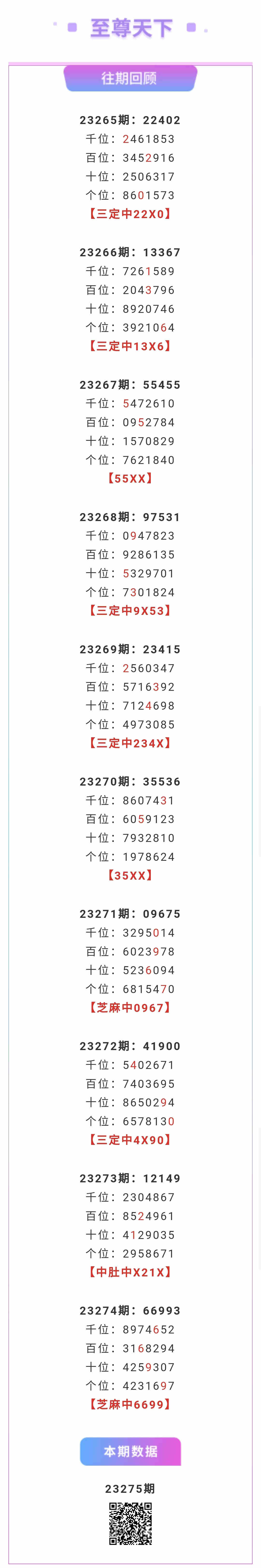 【排列五-23275期】本月圈中2次芝麻,芝麻近10中2;上期芝麻中6699