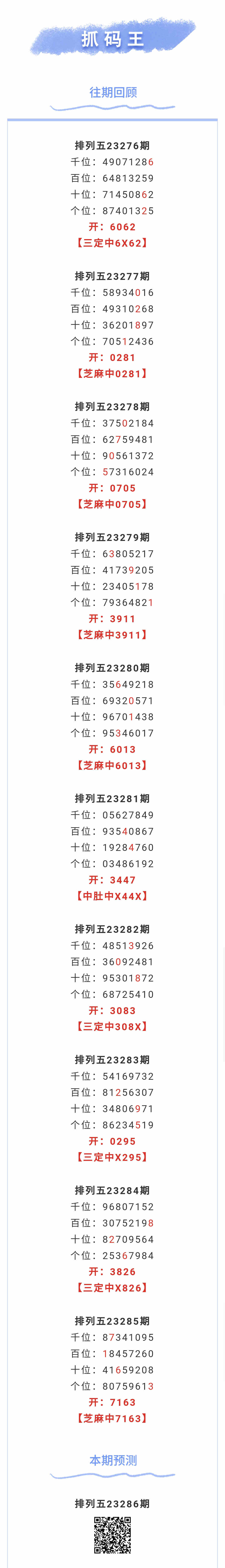【排列五-23286期】本月圈中7次芝麻,芝麻近10中5;上期芝麻中7163