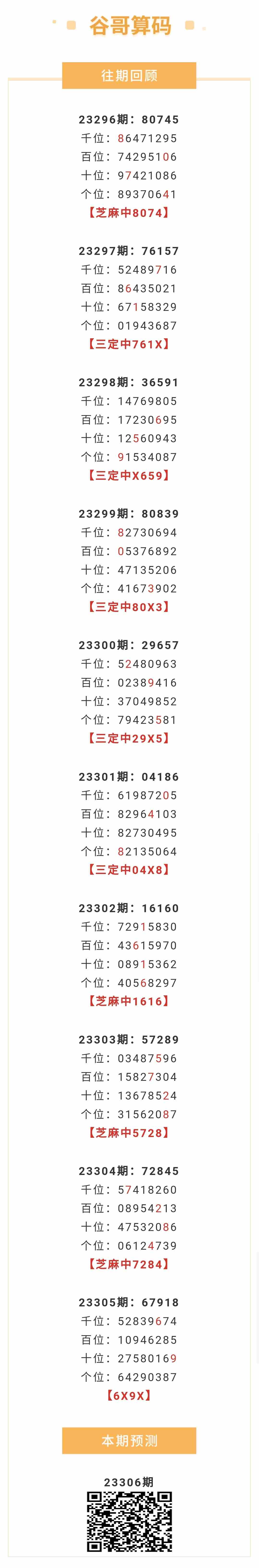 【排列五-23306期】本月圈中9次芝麻,芝麻近10中4;上期二定中6X9X