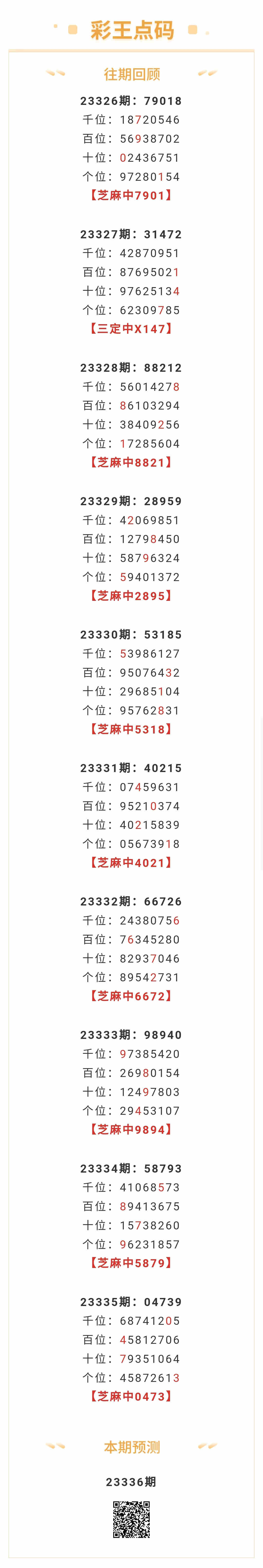 【排列五-23336期】本月圈中11次芝麻,芝麻近10中9;上期芝麻中0473
