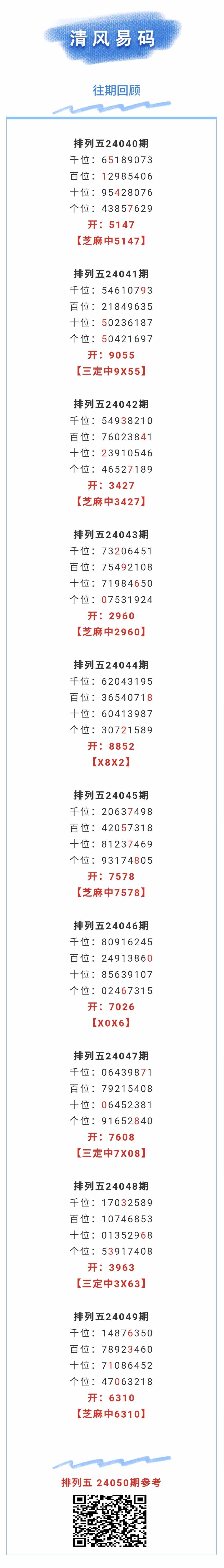 【排列五-24050期】本月圈中8次芝麻,芝麻近10中5;上期芝麻中6310