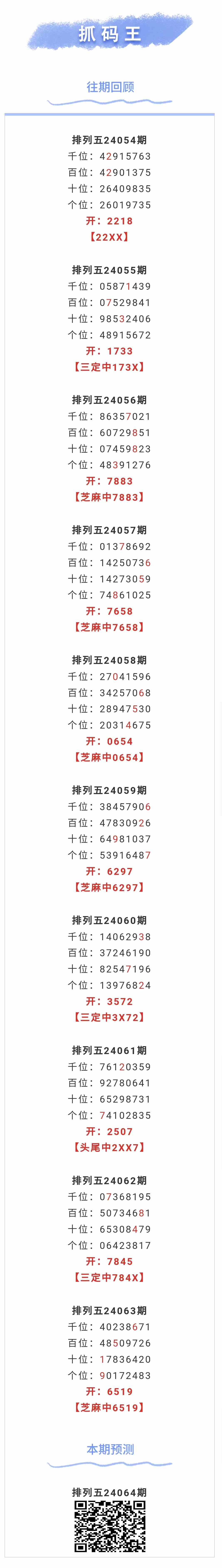 【排列五-24064期】本月圈中6次芝麻,芝麻近10中5;上期芝麻中6519
