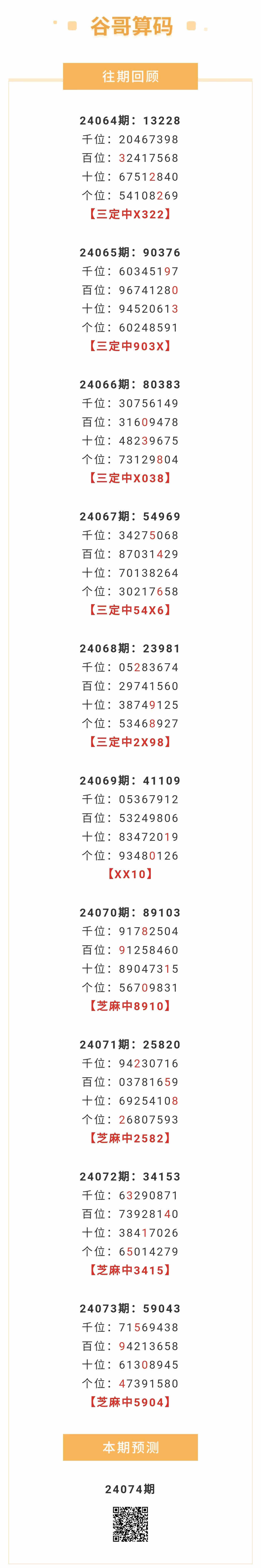 【排列五-24074期】本月圈中9次芝麻,芝麻近10中4;上期芝麻中5904