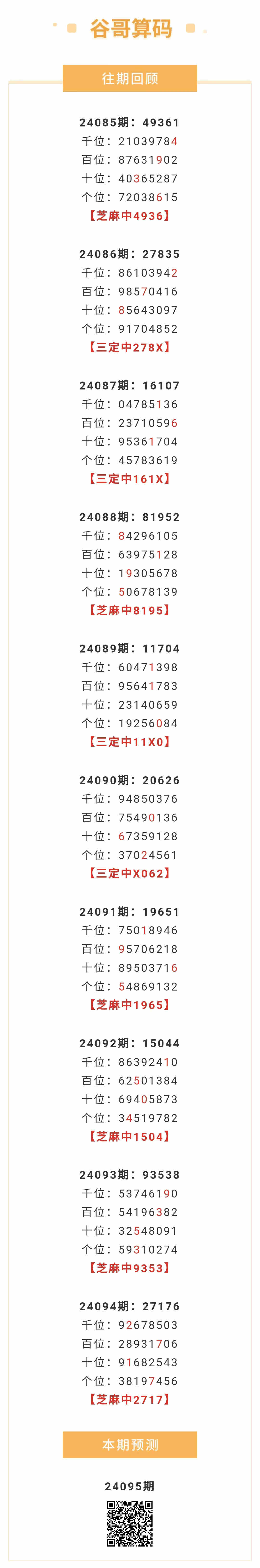 【排列五-24095期】本月圈中6次芝麻,芝麻近10中6;上期芝麻中2717
