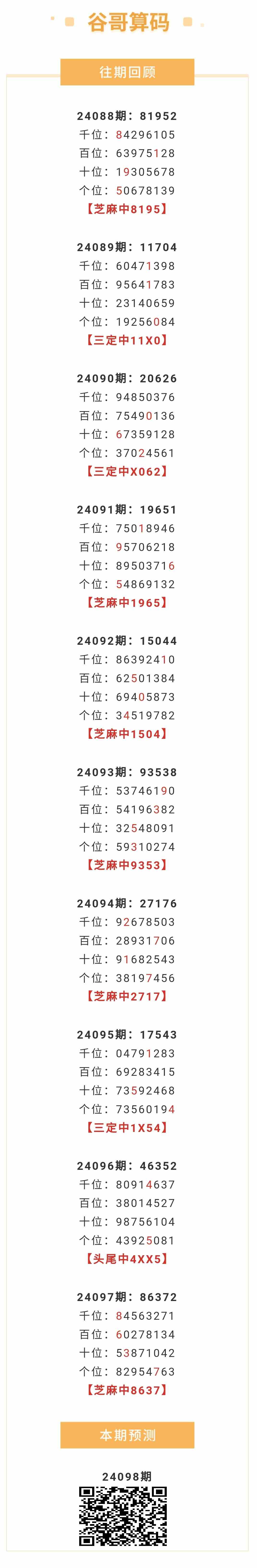【排列五-24098期】本月圈中7次芝麻,芝麻近10中6;上期芝麻中8637