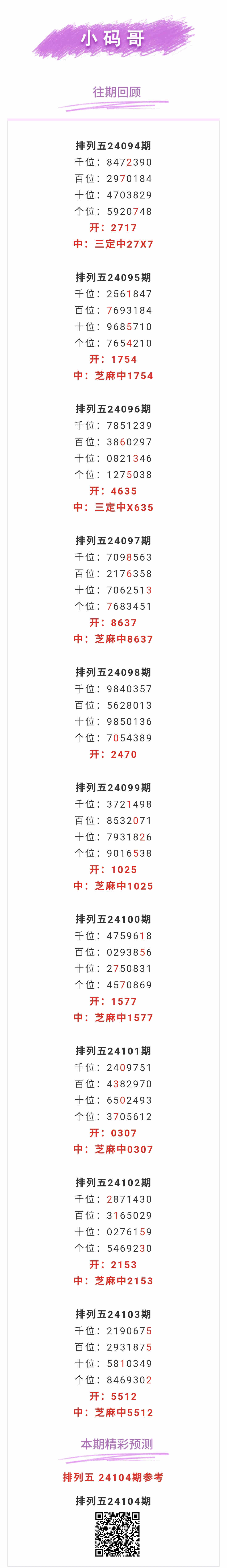【排列五-24104期】本月圈中12次芝麻,芝麻近10中7;上期芝麻中5512