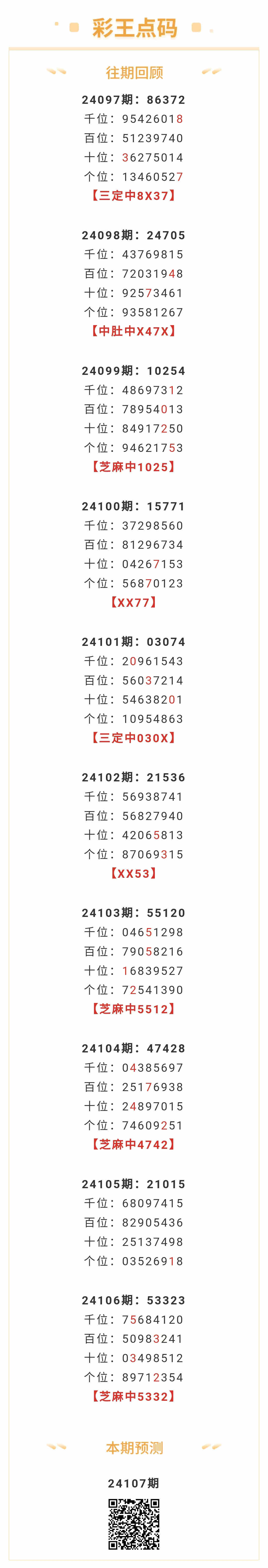 【排列五-24107期】本月圈中9次芝麻,芝麻近10中4;上期芝麻中5332