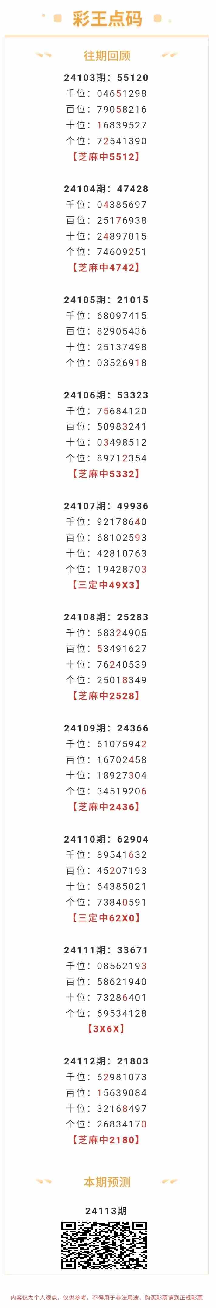 【排列五-24113期】本月圈中1次芝麻,芝麻近10中6;上期芝麻中2180