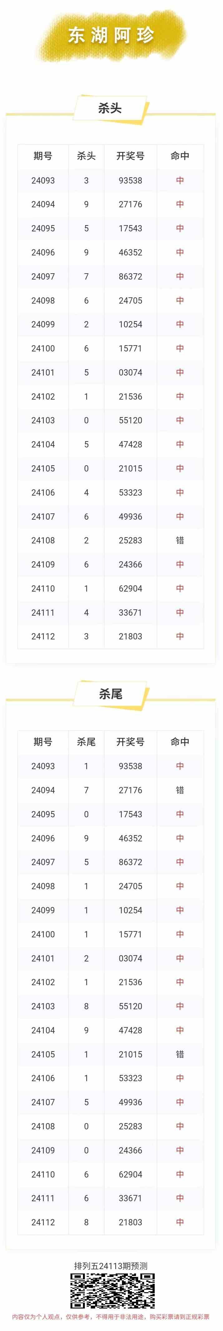 【排列五-24113期】本月圈中1次杀头尾,杀头尾近10中8;上期杀头尾中