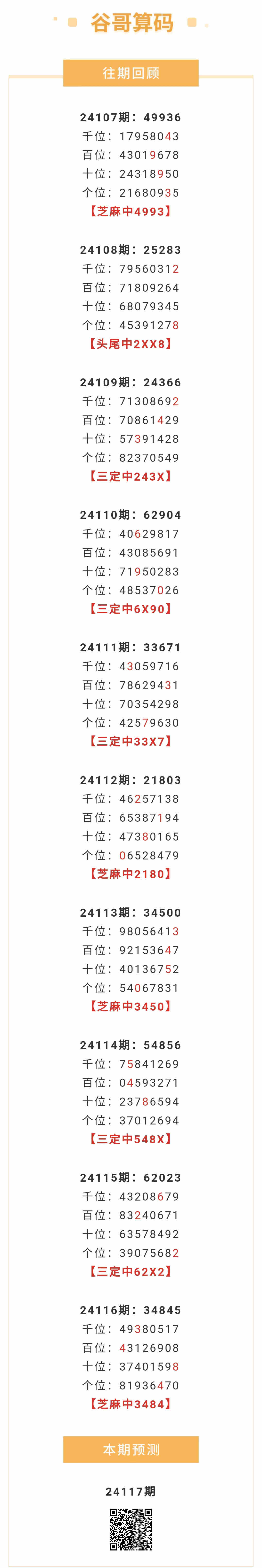 【排列五-24117期】本月圈中3次芝麻,芝麻近10中4;上期芝麻中3484