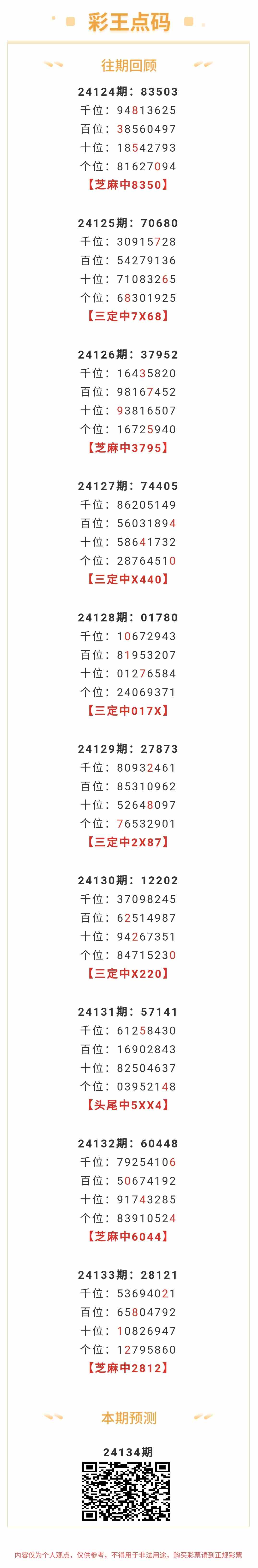 【排列五-24134期】本月圈中8次芝麻,芝麻近10中4;上期芝麻中2812