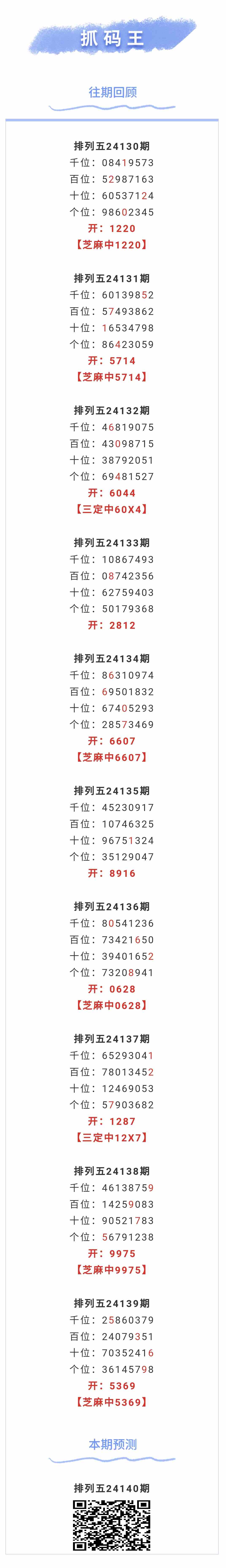 【排列五-24140期】本月圈中15次芝麻,芝麻近10中6;上期芝麻中5369